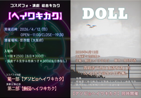 11:00 OPEN 受付開始・入場(先着順) 11:30 第1部 開演【アソビ☆ヘイワキカク】16:00 第2部 開演【劇団ヘイワキカク】 19:30 CLOSE 終演・退場 前売り2500円 当日3000円 ゲネプロ見学つき3000円 |