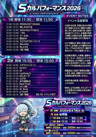1部 開場11:30 開演11:50 2部 開場15:35 開演15:50 1部、2部ともに前売り2500円/当日3000円(別途ドリンク代 500円 1部、2部通し券4500円/当日 5000円(別途ドリンク代 500円) |
