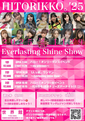 《1部》my precious〜推しへの愛よ永遠に〜 《2部》Everlasting Shine Show 《3部》1129冬冬!泡沫チューズデーナイト!ミニ! 1部:2500円 + 別途1D(500円) 2部:2500円 3部:2000円 𝐄𝐱𝐞𝐜𝐮𝐭𝐢𝐯𝐞 Ticket:8600円 + 別途1D(500円) |